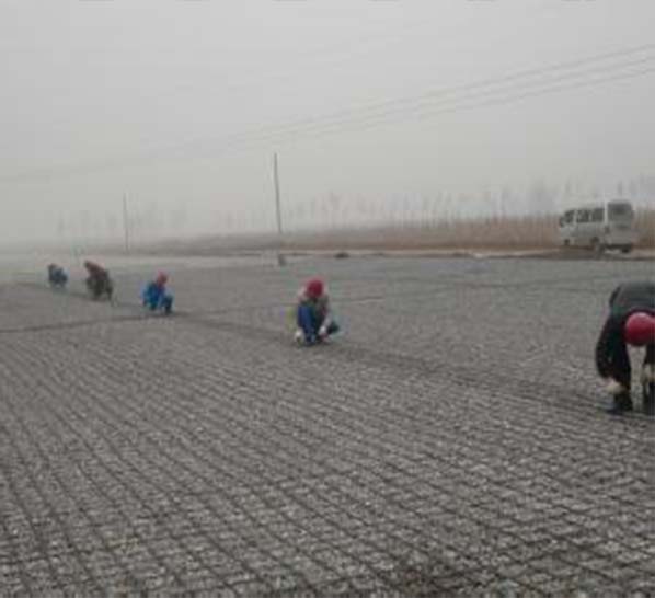 7、橋臺(tái)地基一般很容易向下沉陷,出現(xiàn)跳車現(xiàn)象,在橋臺(tái)地基下鋪設(shè)土工格柵,可提高承載力,穩(wěn)固橋臺(tái)。